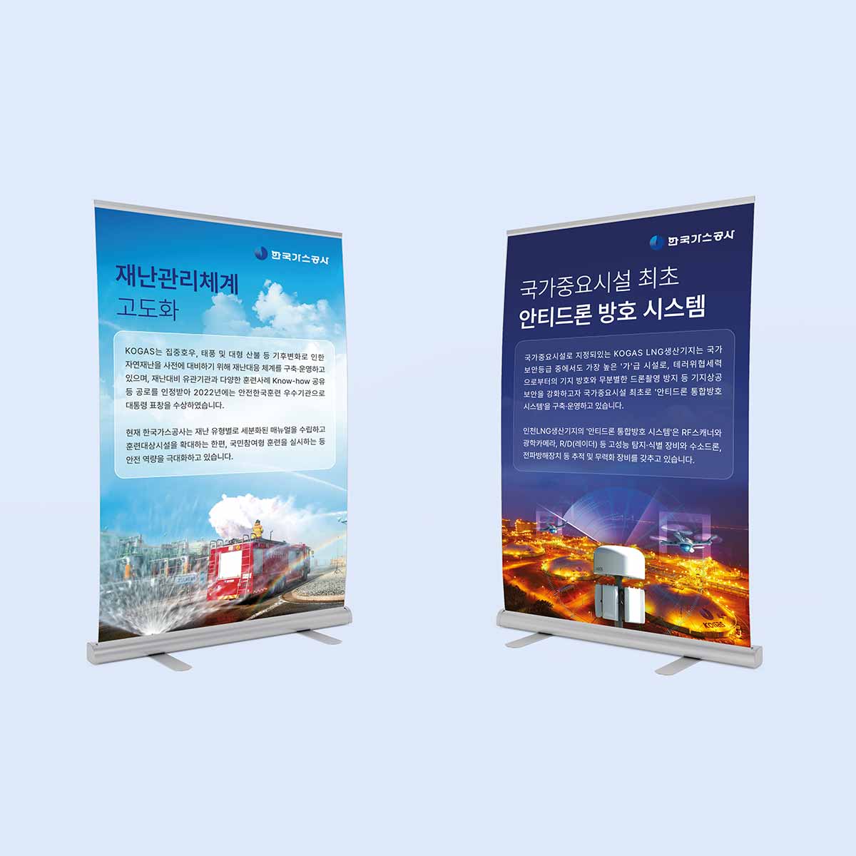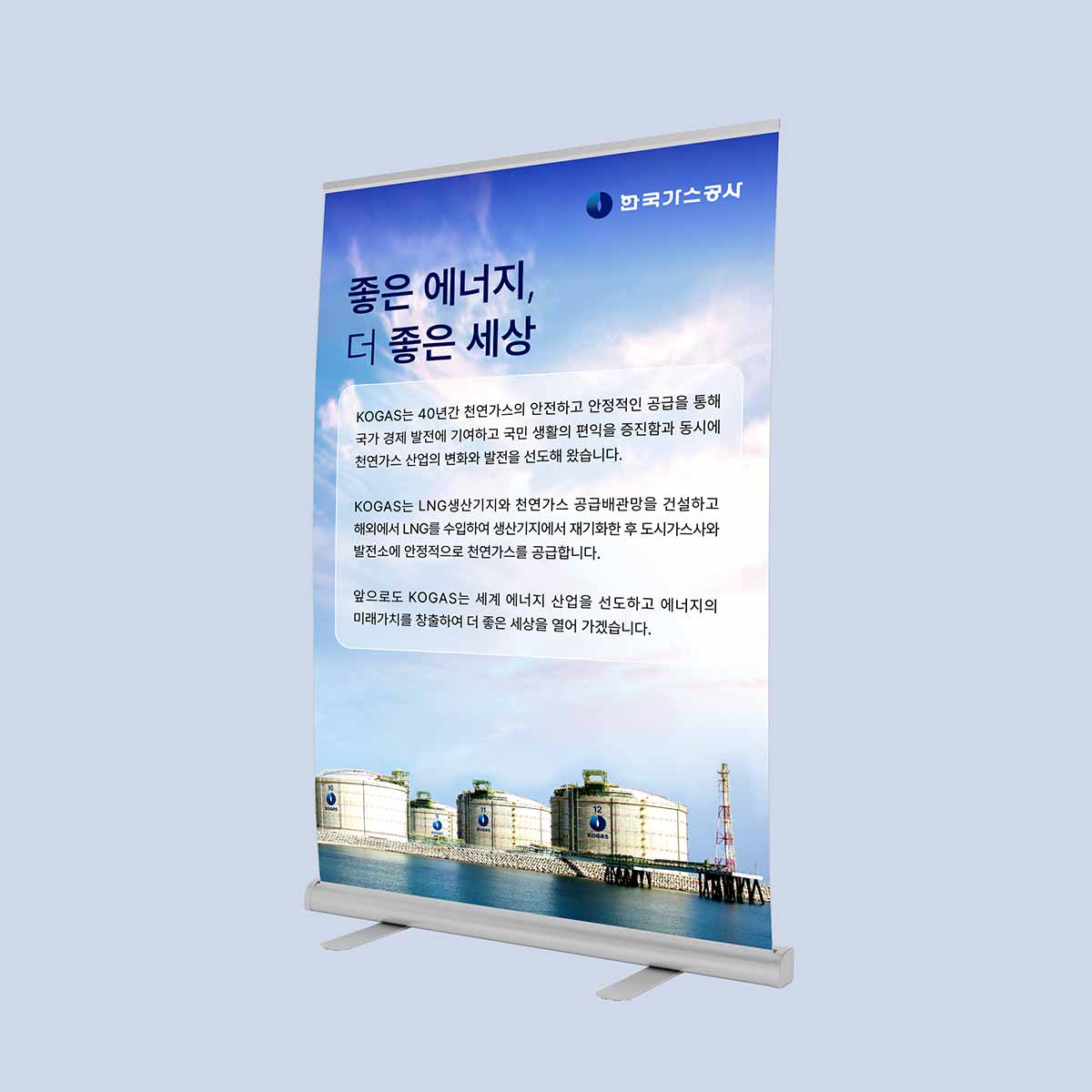한국가스공사의 전시 배너 디자인은 천연가스의 안정적인 공급을 통한 에너지 산업의 선도적 역할을 시각적으로 표현하였습니다. 전체적으로는 신뢰감 있는 컬러 톤과 실제 현장 이미지를 활용해 공사의 공공성과 기술력을 조화롭게 전달하고자 하였습니다.