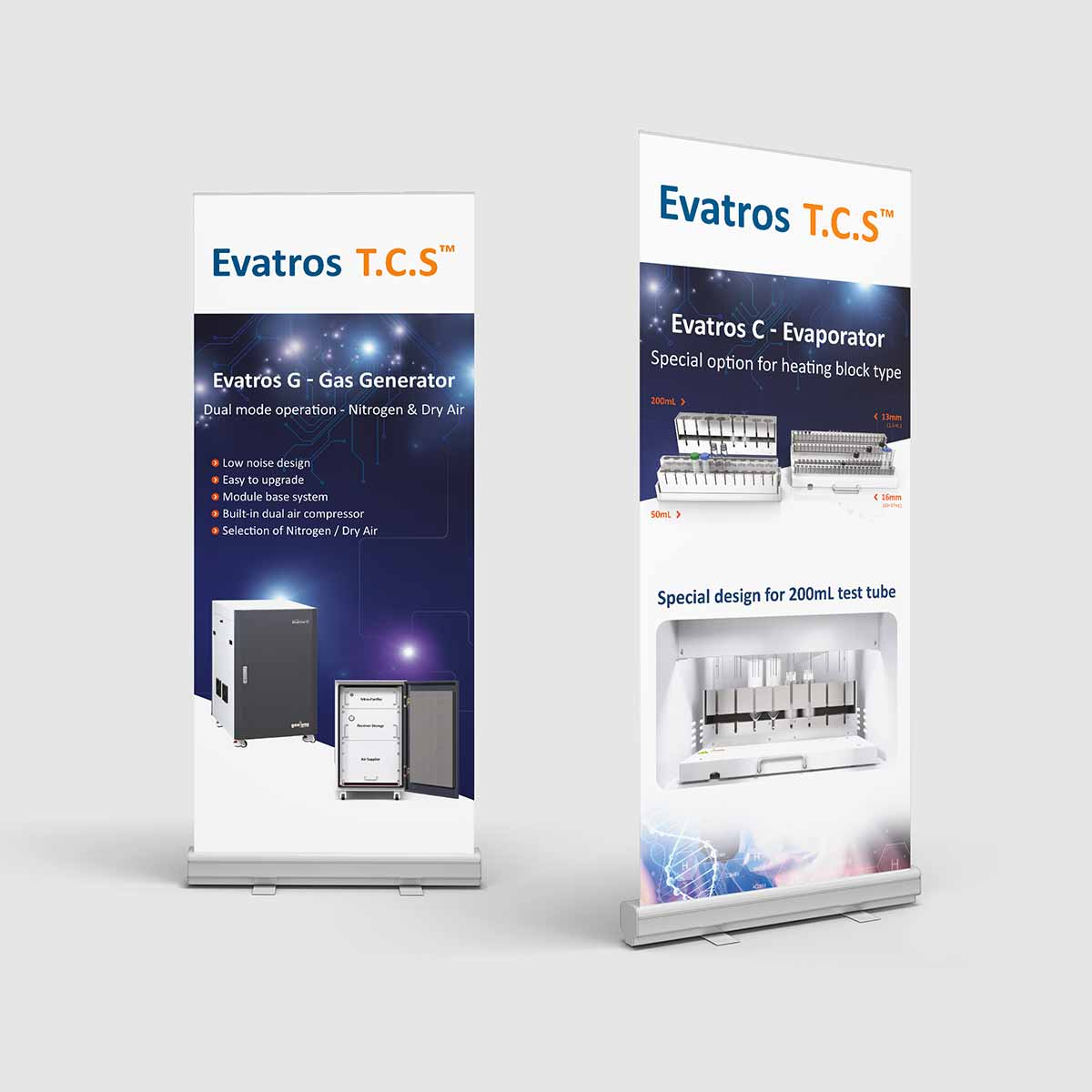 Evatro T.C.S 시리즈 배너는 All-in-One Lab Solution이라는 핵심 메시지를 중심으로 실험 장비의 기능성, 효율성, 전문성을 명확하고 세련되게 전달하는 B2B형 기술 홍보 디자인입니다.