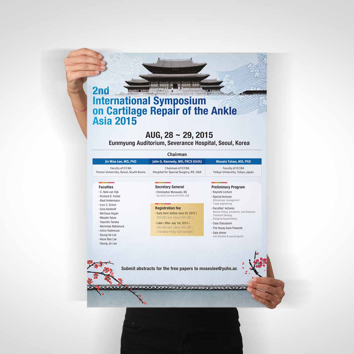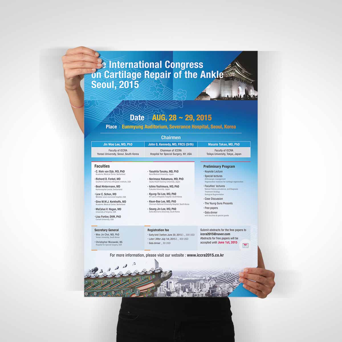 국제 의료 학회 포스터 디자인은 학술성과 장소성을 효과적으로 시각화한 사례입니다. 서울에서 열리는 학회인 만큼, 경복궁, 한국 전통 문양, 건축물 이미지를 배경 또는 하단 그래픽 요소로 활용해 지역적 아이덴티티를 강조하였습니다.