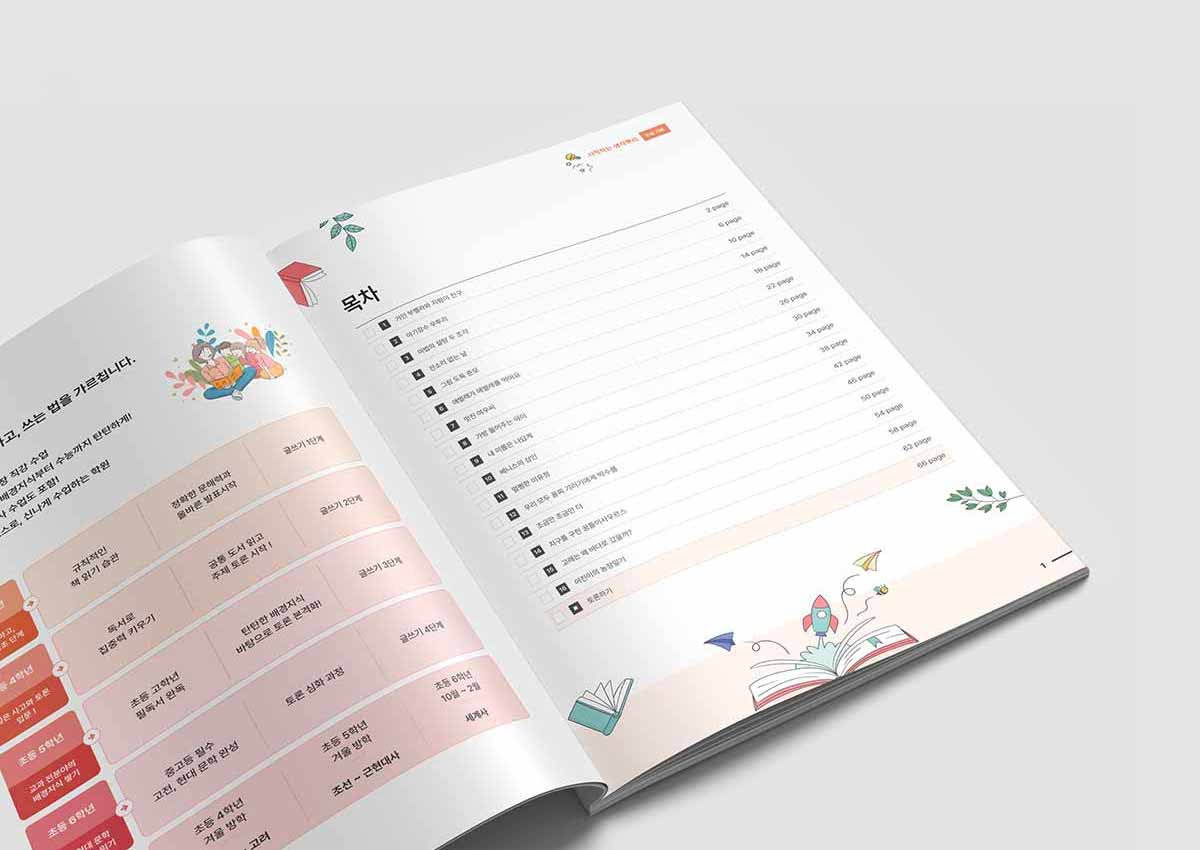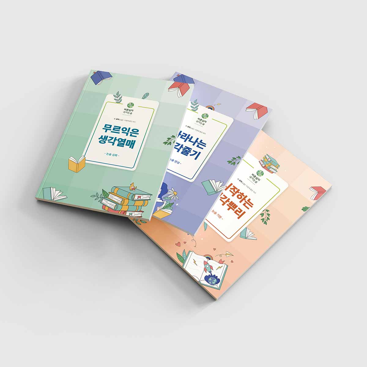 국어 논술 학원의 특성과 교육 목적을 반영한 밝고 친근하면서도 학구적인 분위기를 담고 있습니다. 주요 디자인 컨셉은 “논리적 사고를 즐겁고 자연스럽게 키우는 과정”을 시각화한 컨셉입니다.