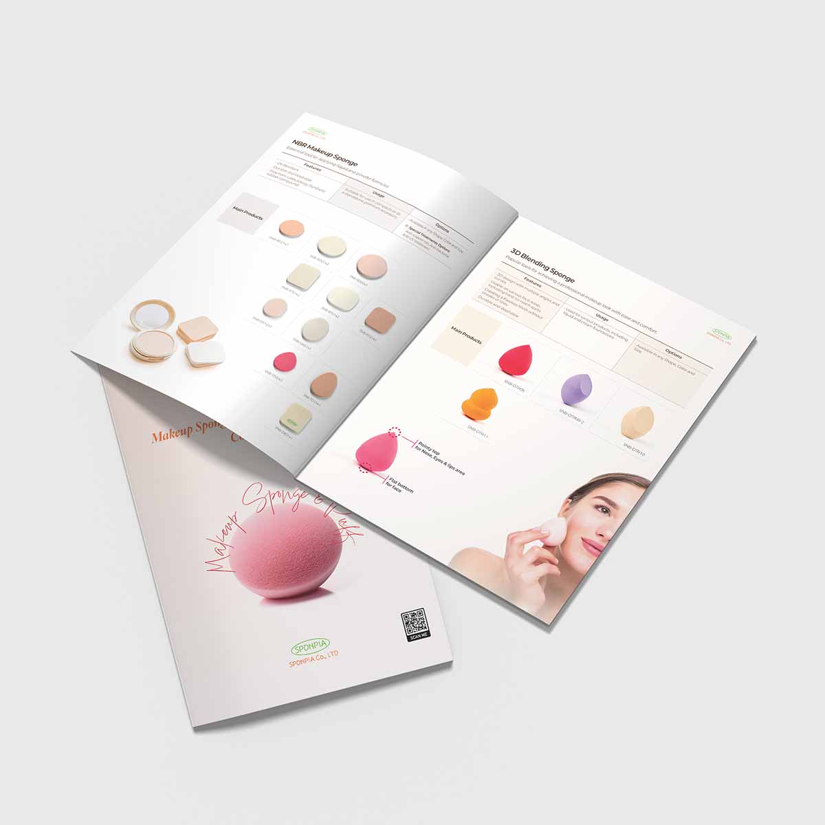커버에는 대표 제품인 메이크업 스펀지를 배치해 아이덴티티를 명확히 하고, 내부는 다양한 스펀지 타입과 특징을 사진 중심으로 보여줌으로써 제품의 다양성과 전문성을 강조하였습니다.